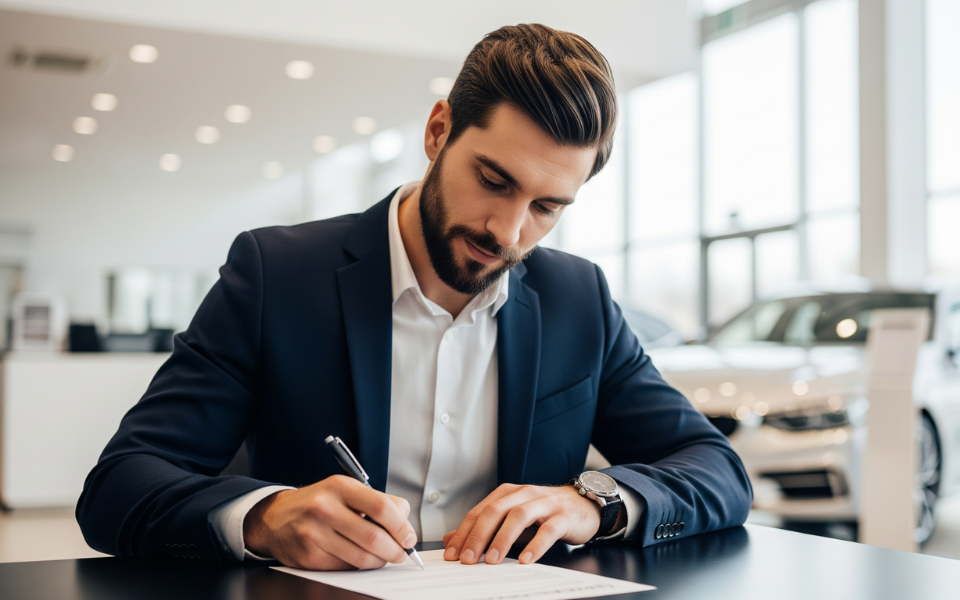 A man signing papers at the car dealership